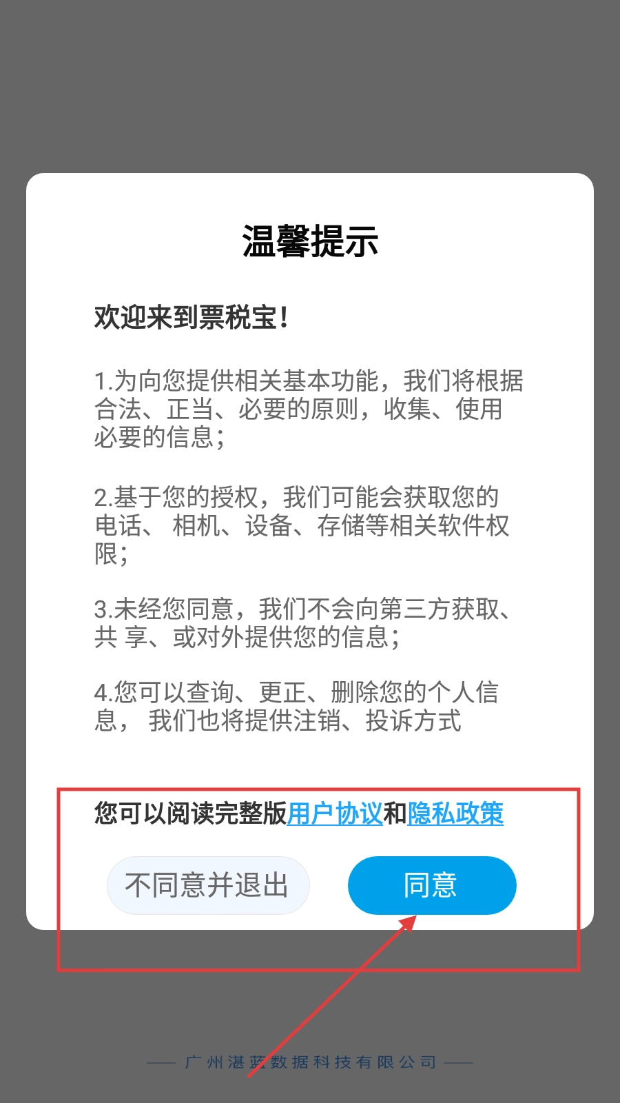 在使用【票税宝】之前,您需要仔细阅读《用户协议》与《隐私政策》,只有点击【同意】按钮,才能继续使用该软件。