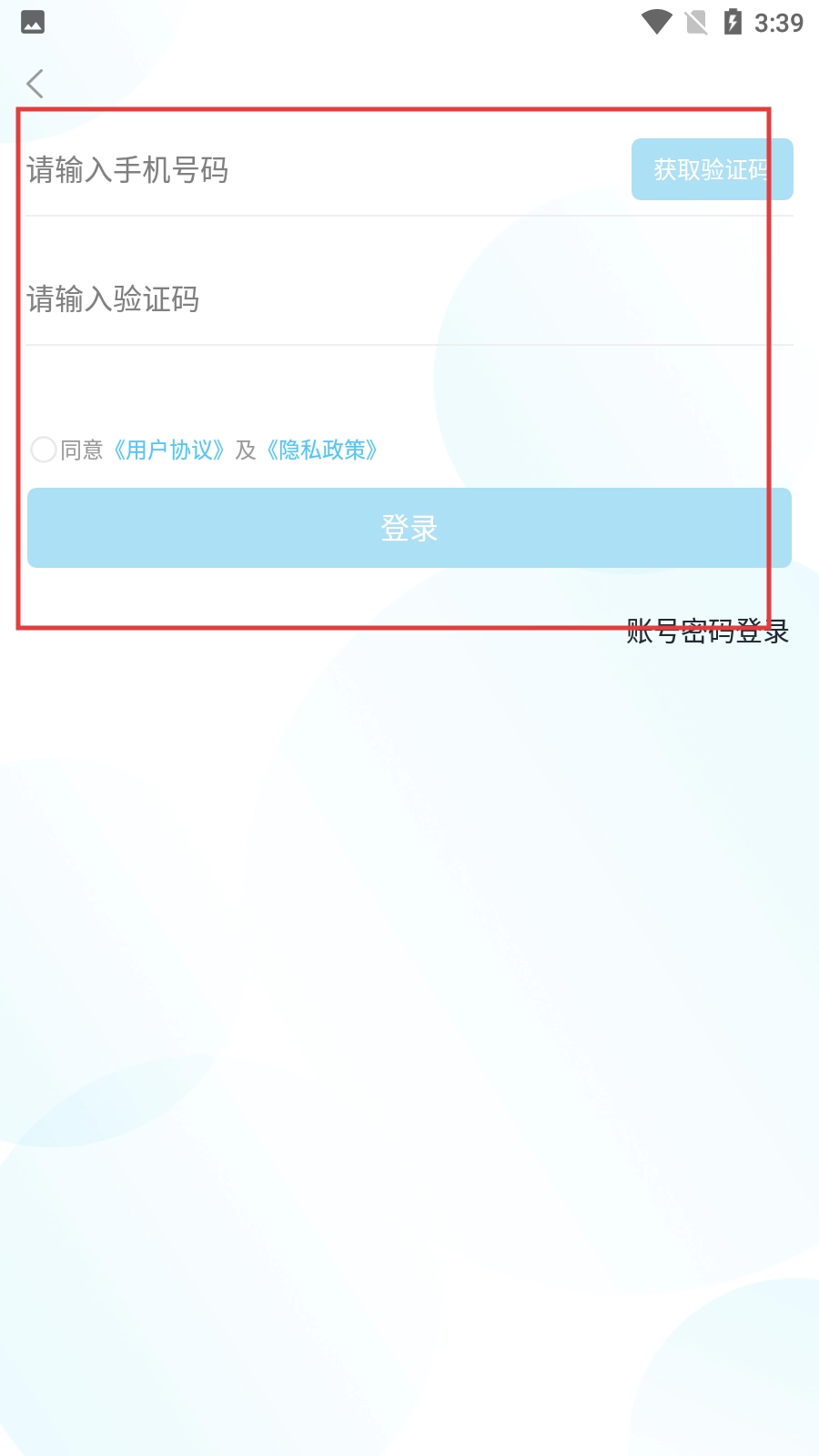在登录页面,输入手机号码,点击【获取验证码】按钮,输入收到的验证码后,勾选同意用户协议和隐私政策,最后点击【登录】按钮完成登录操作。