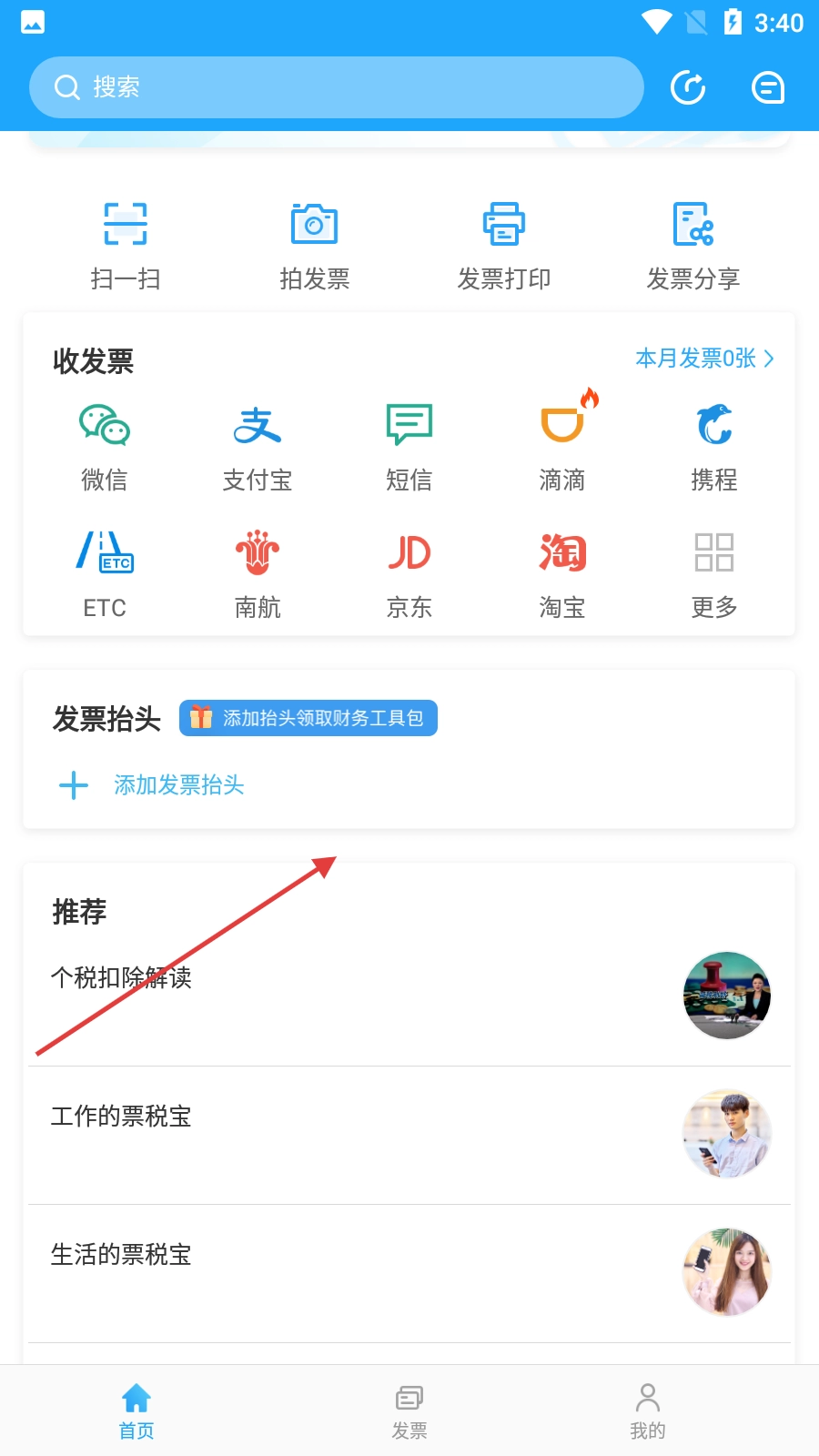 进入首页后,可使用扫一扫、拍发票、发票打印、发票分享等功能。