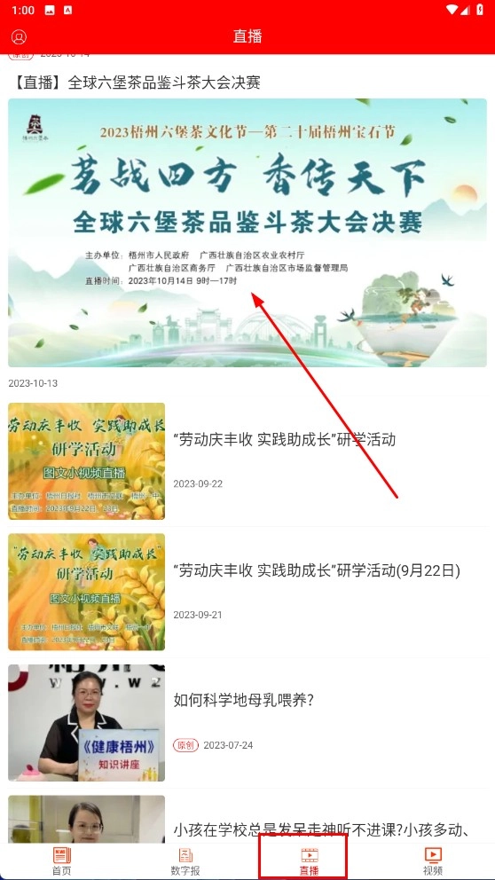 3、点击底部的【直播】功能按钮,进入直播页面后,选择标题为【全球六堡茶品鉴斗茶大会决赛】的直播内容。