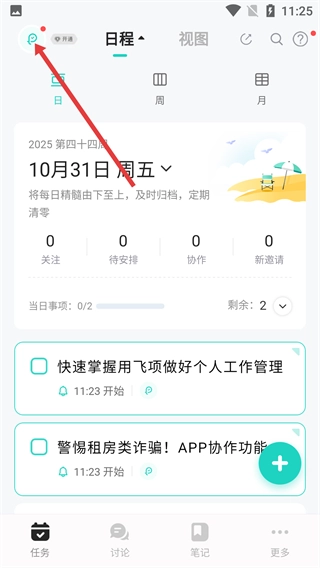 进入飞项的任务页面后,点击左上角的功能图标,即可进入涵盖快速上手、常用工具等功能的页面。