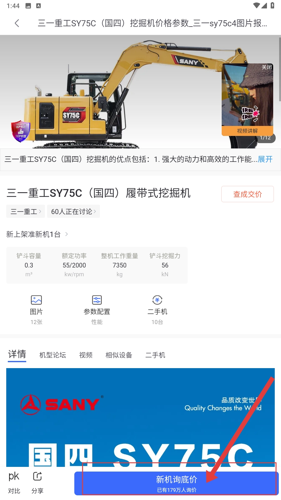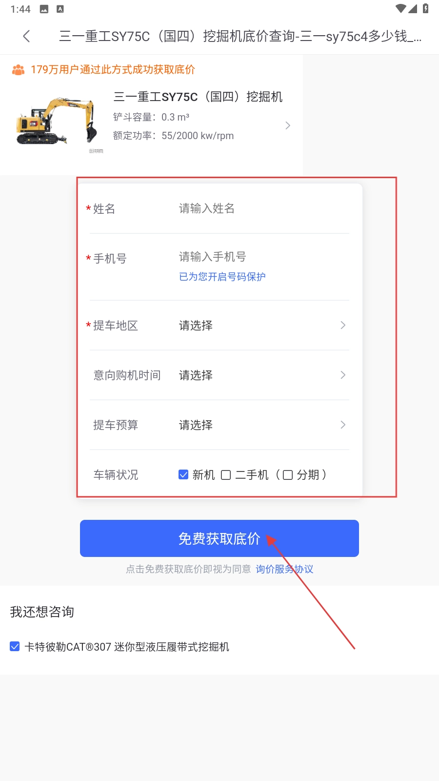 3、进入挖掘机的具体详情页后,点击【新机询底价】功能按钮,即可进入询价页面。