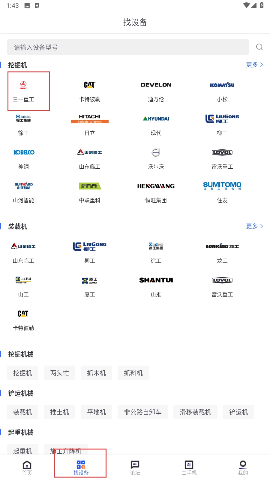 1、点击【找设备】功能按钮,进入找设备页面后,选择【三一重工】品牌标识。