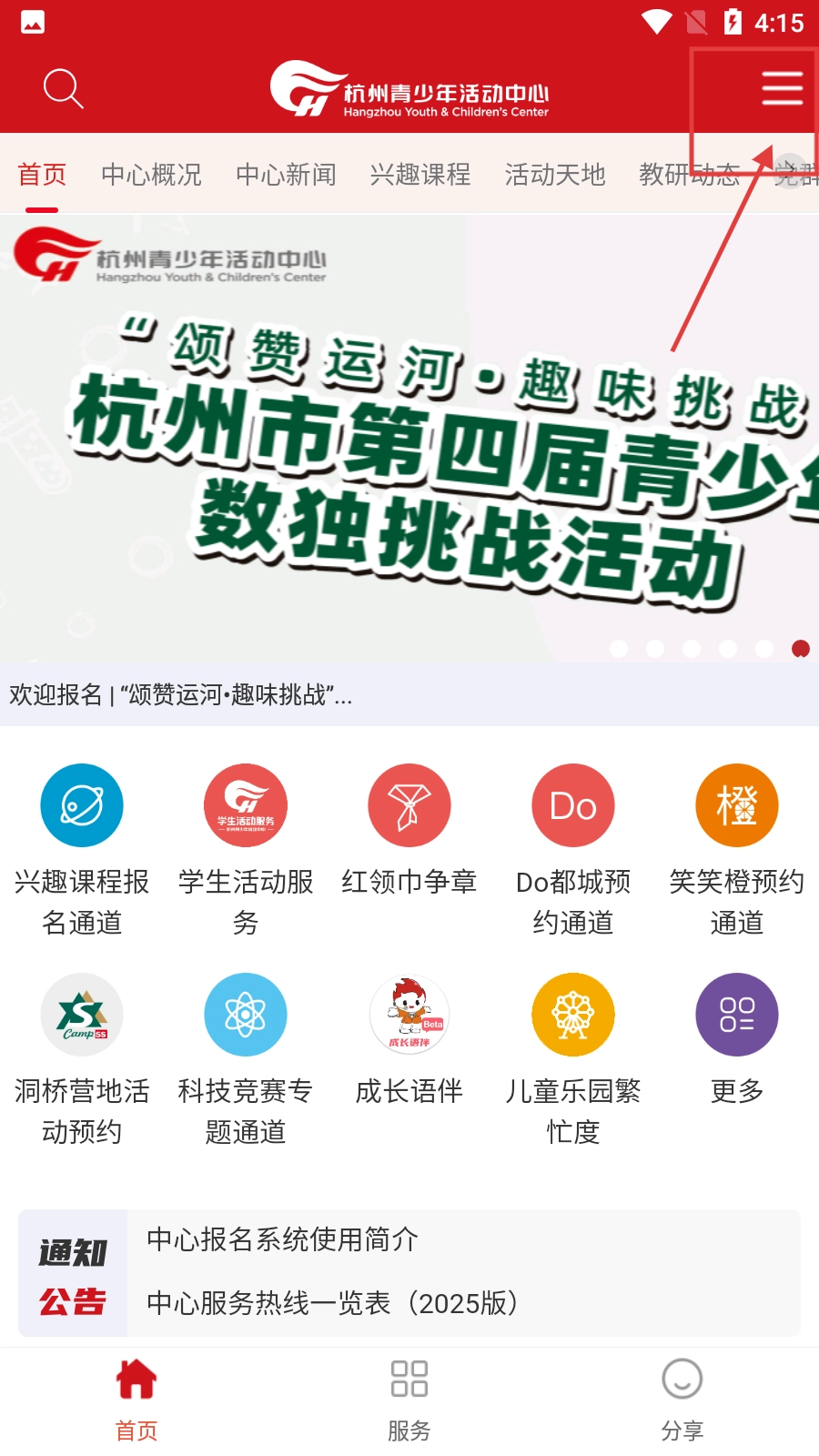 1、在杭州青少年活动中心首页,点击右上角的菜单按钮,使菜单展开。
