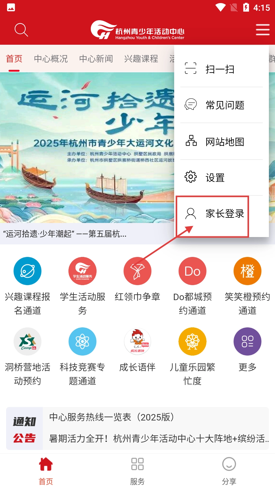 2、在展开的菜单里点击【家长登录】选项,即可进入登录界面。