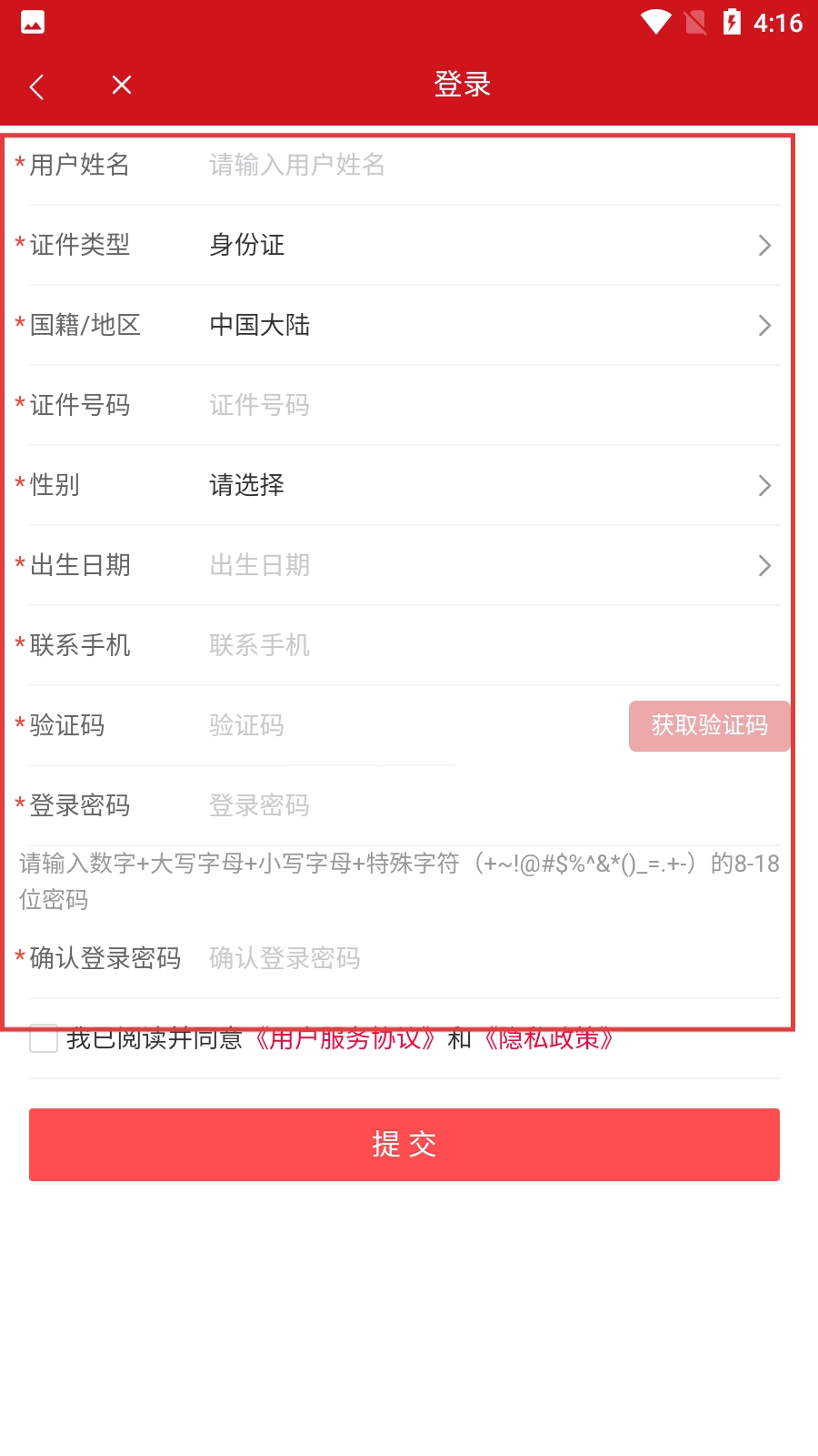 4、进入注册页面后,按顺序填写用户姓名、证件类型、国籍/地区、证件号码等信息,随后点击【提交】按钮,即可完成注册流程。
