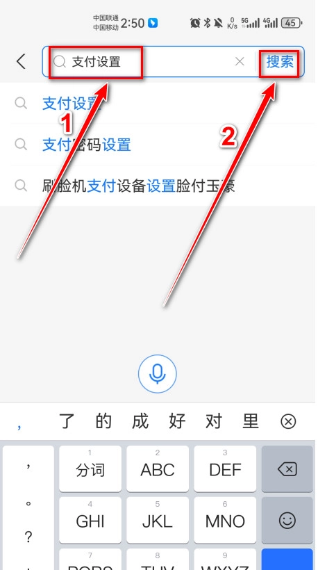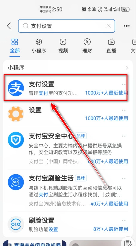 2.先输入支付设置,再点击搜索。