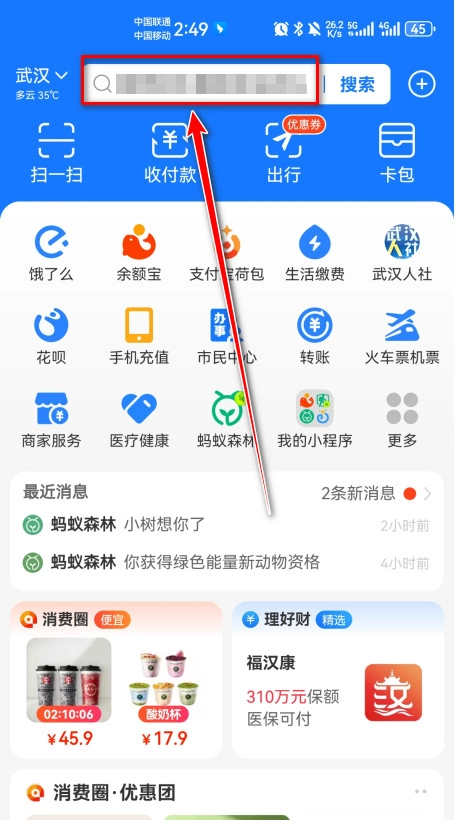 1.打开支付宝主页,点击首页上方的搜索框。