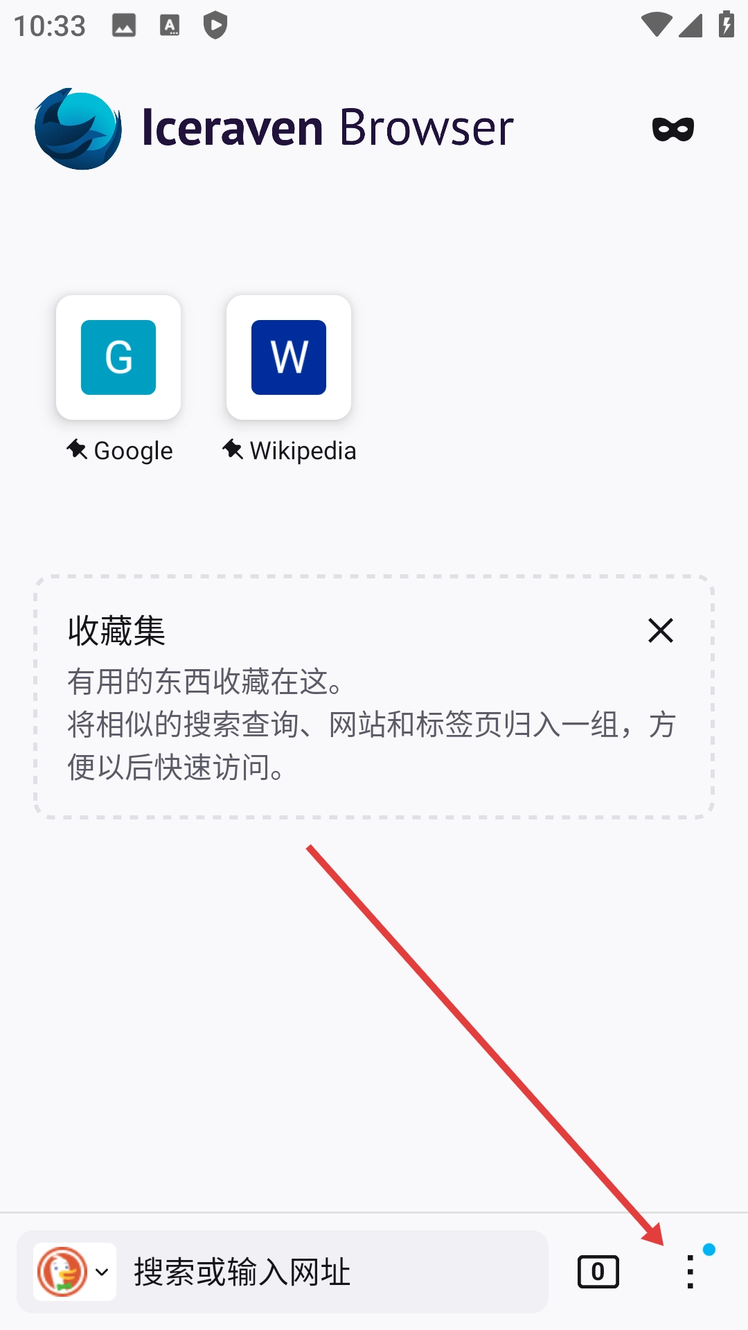 1、在Iceraven-Browser界面中,点击右下角的三点菜单按钮,展开功能菜单。