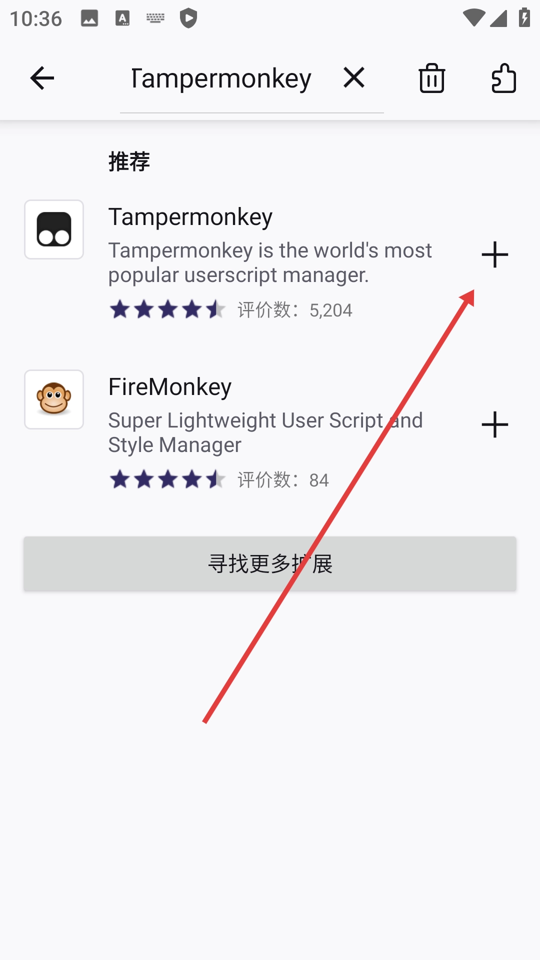 4、在搜索结果里找到【Tampermonkey】,点击它右边的加号按钮,就能完成扩展添加的操作。