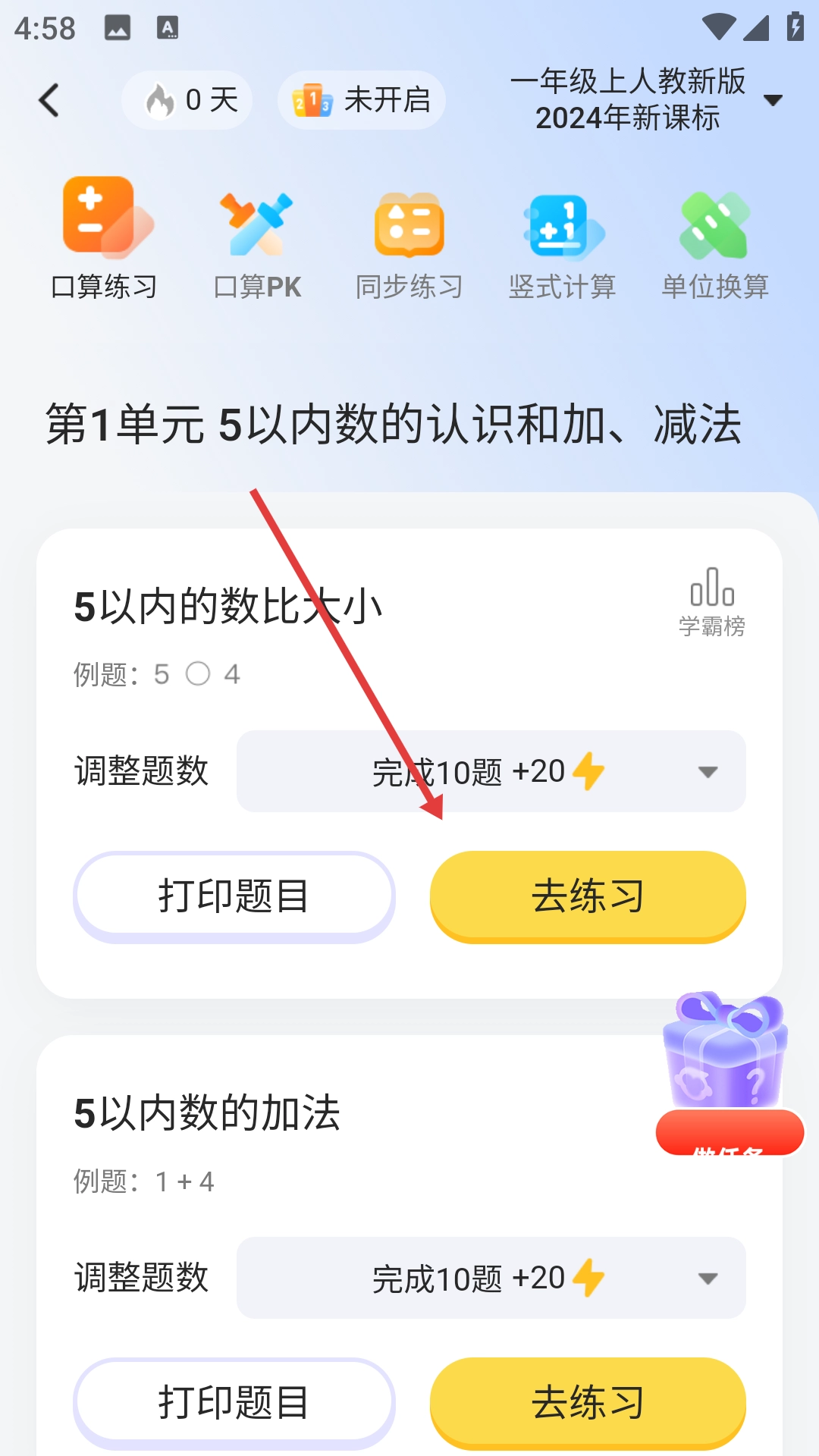 4、在口算练习页面选定具体的练习内容后,点击【去练习】按钮即可开启口算训练。