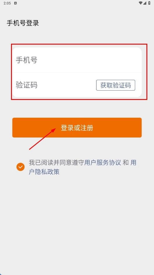 2、进入手机号登录界面后,填写手机号与验证码,点击【登录或注册】功能按钮,即可完成登录或注册流程。