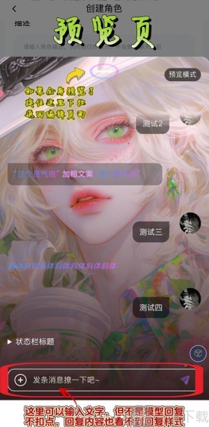 8.点击【预览】按钮后,即可查看聊天界面。在聊天框中输入文字就能进行测试,在此处发送聊天内容不会消耗点数。
