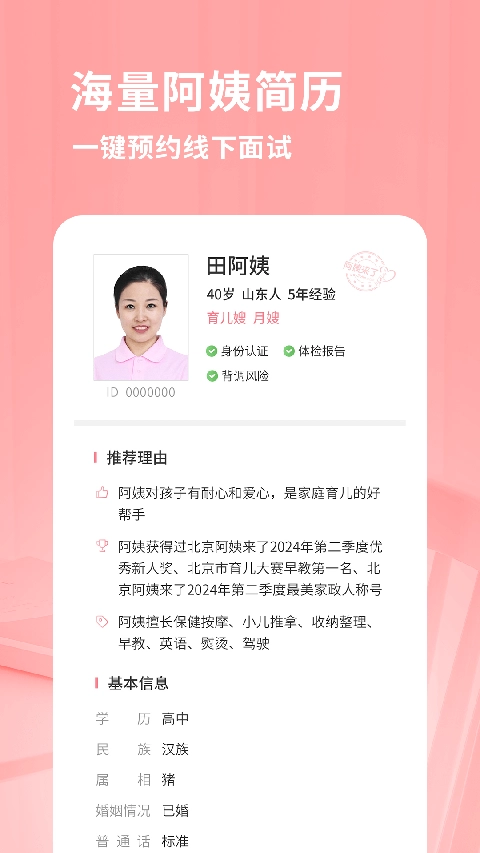 1、全面呈现阿姨的详细资料,涵盖工作经历与专业技能,方便雇主依据自身需求挑选契合的人选。