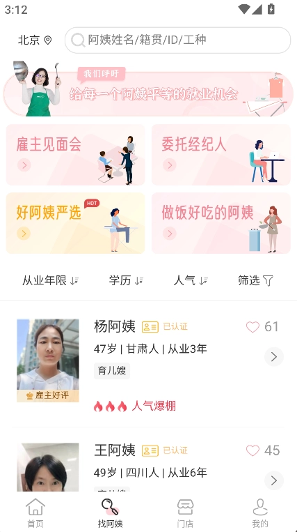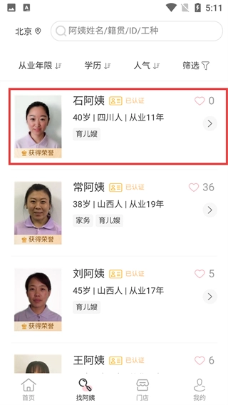 2、进入【找阿姨】页面后,能借助【从业年限】-【学历】等筛选条件,查看经过认证的阿姨信息。