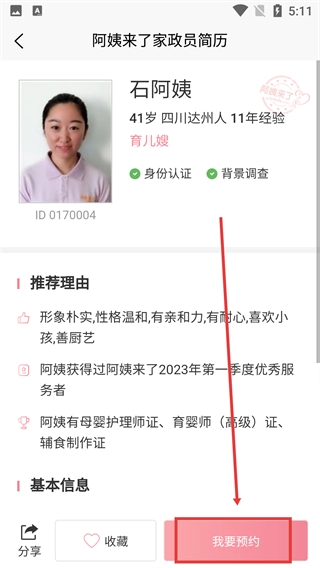 3、进入阿姨简历页面,查看【石阿姨】的认证信息、推荐理由等内容,确认合适后,点击页面底部的【我要预约】按钮,就能发起预约流程。