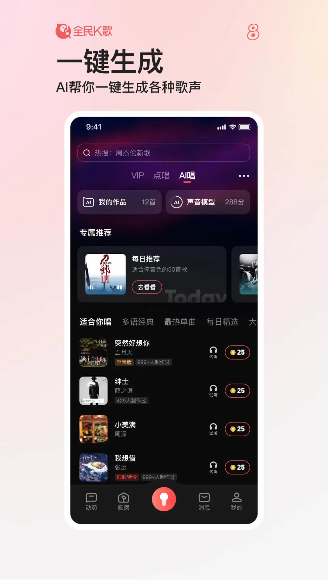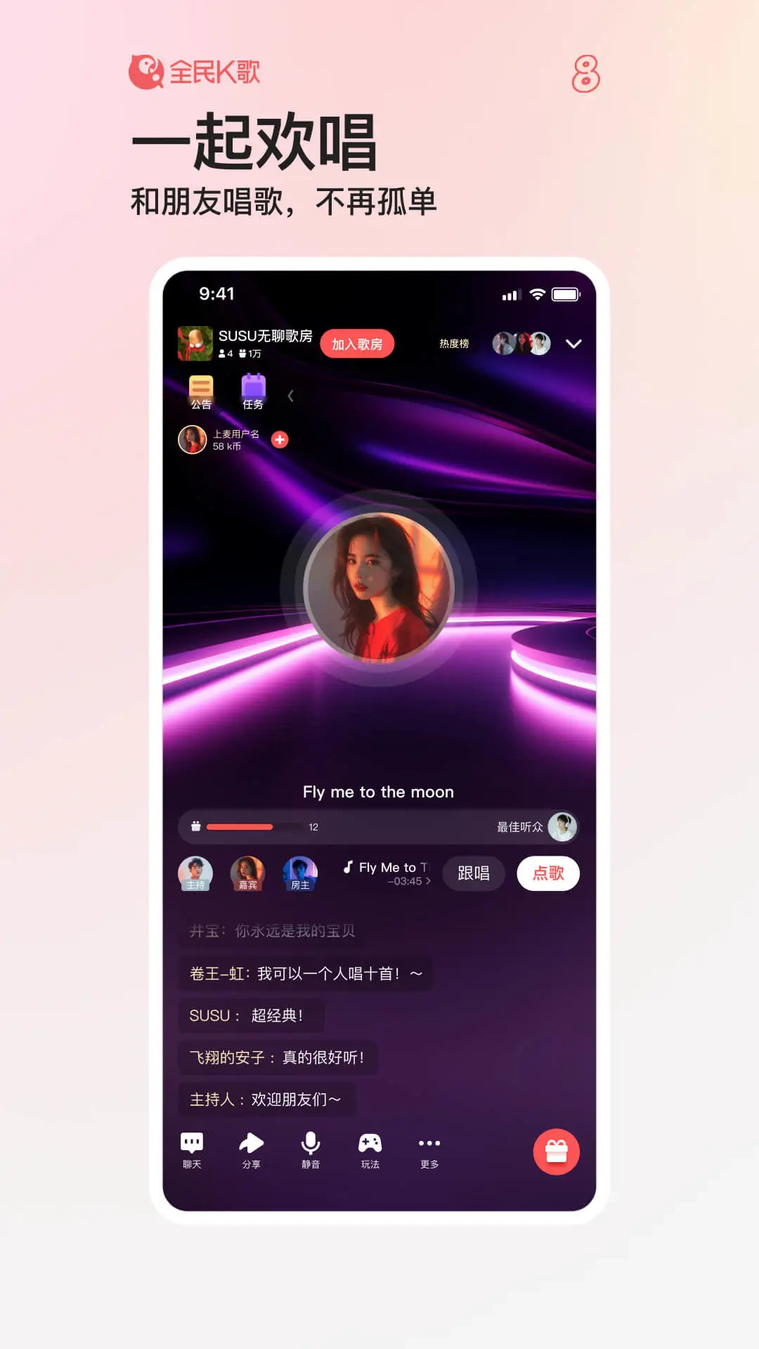 想展现你的歌声魅力吗?全民K歌2024最新版为你搭建了一个自由欢唱的舞台。这款腾讯出品的K歌交友应用,坐拥海量高清伴奏资源,经典老歌与流行热曲应有尽有;其独创的智能评分系统可实时反馈演唱效果,即便五音不全,也能借助趣味调音找回自信。你能随时录制专属作品,和好友在线PK唱功,还能通过弹幕互动增添乐趣。练歌模式助力提升演唱技巧,段落重唱功能则让每一处细节都更趋完美。现在就加入千万音乐爱好者的队伍,用声音打动世界,喜欢的话就来试试吧!