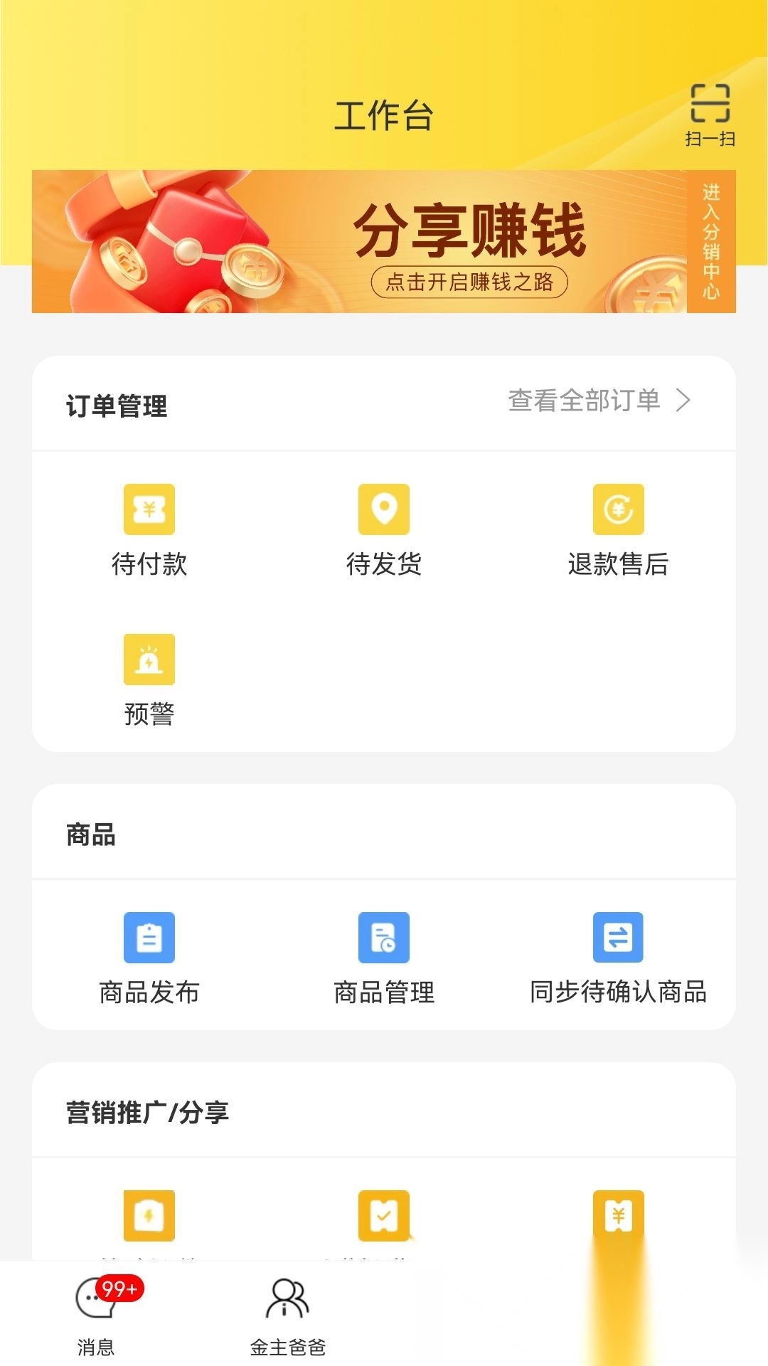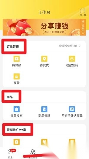 3、点击底部的“工作台”按钮,就能开展订单管理、商品发布、商品同步以及营销推广等相关操作。