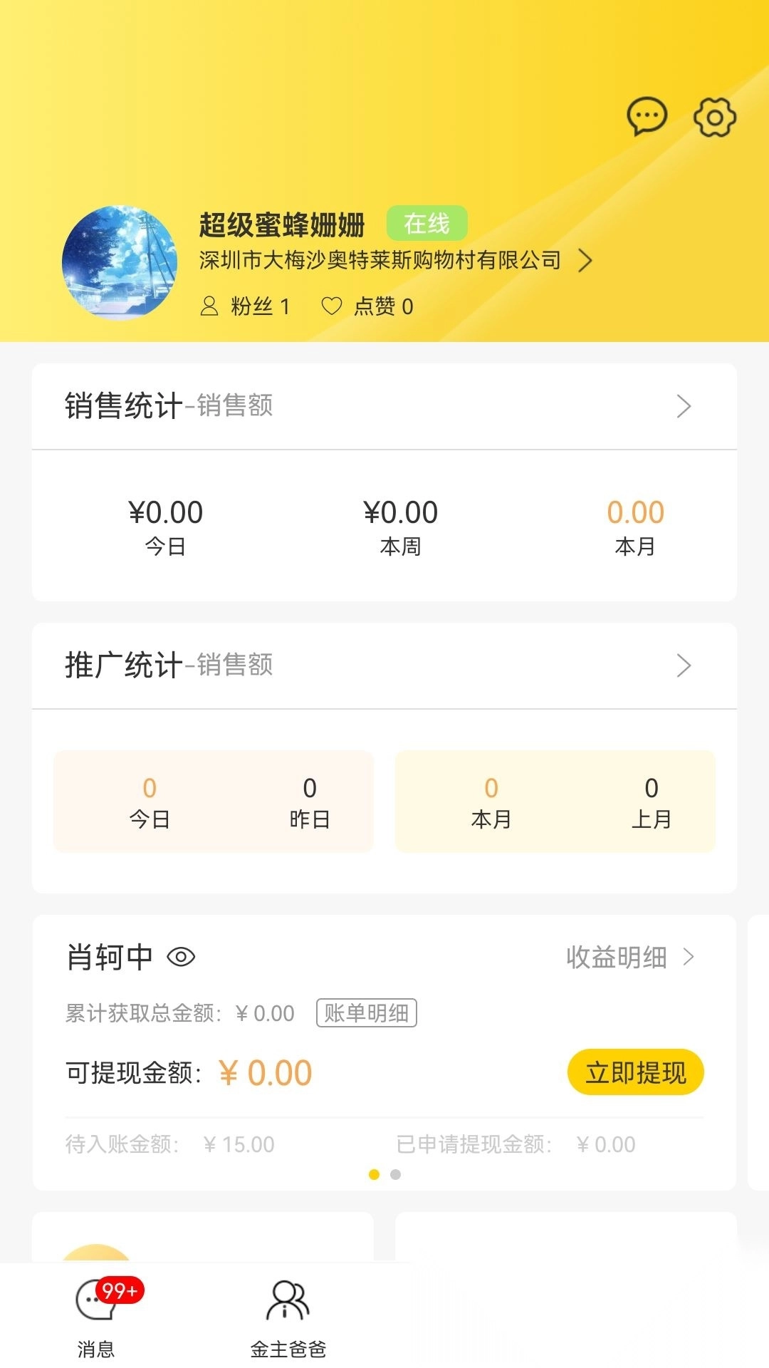 4、在“我的”页面能够查看销售与推广的统计数据,以便实时了解业务动态和收益状况。