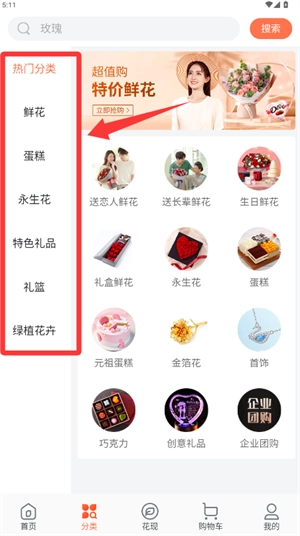 1、进入分类页面后,在热门分类区域里找到鲜花类别并点击进入。