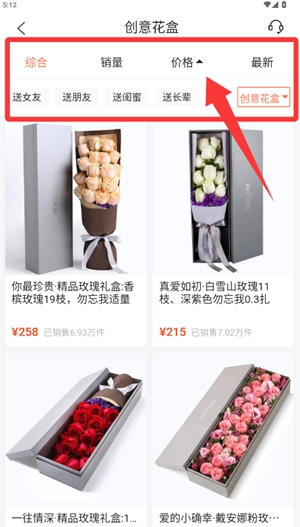 2、进入创意花盒专区后,能通过多种排序方式来筛选出心仪的商品。