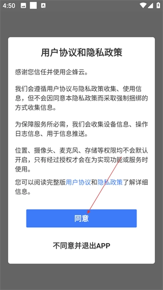 进入企蜂云平台后,首先要阅读《用户协议和隐私政策》,明确信息收集的相关规则,点击“同意”按钮就能继续下一步操作。