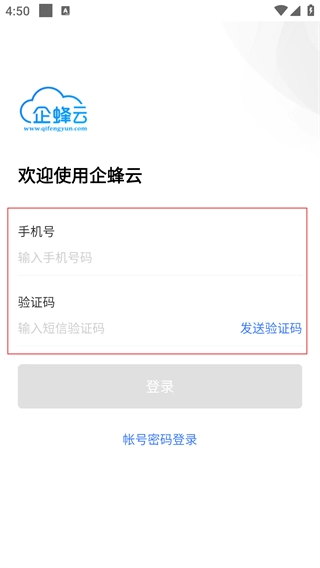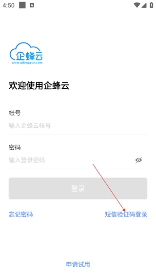 在企蜂云的登录页面,除了通过账号密码进行登录外,还能够选择“短信验证码登录”这一选项,从而切换到验证码登录的操作界面。