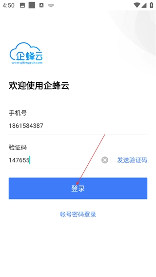 4、在确认手机号和验证码都填写正确后,点击“登录”按钮,就能完成企蜂云账号的登录操作,进而进入应用使用相关服务。
