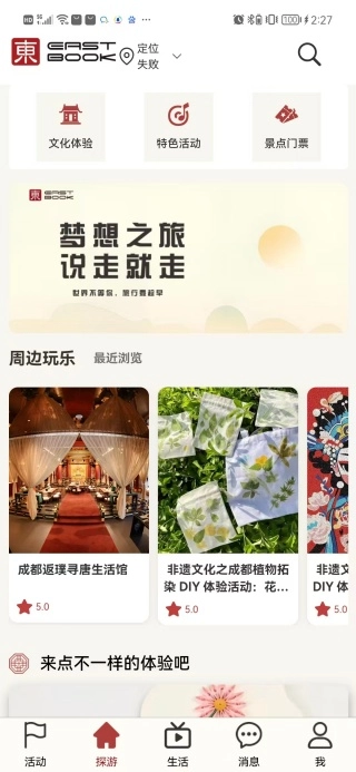2、在探游页面,你可以获取文化体验、特色活动、景点门票等相关信息,还能了解周边的玩乐内容。
