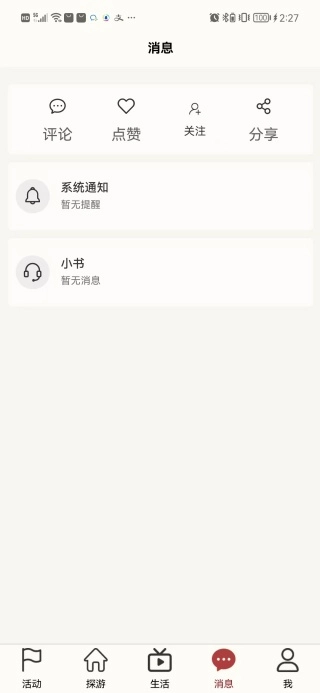 4、消息页面包含评论、点赞、关注和分享相关信息,同时也能查看系统通知内容。