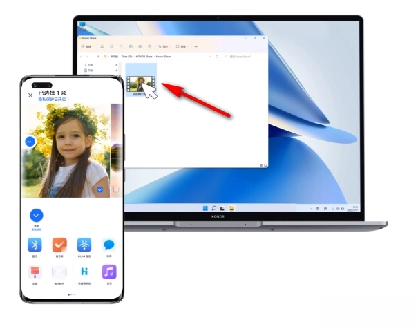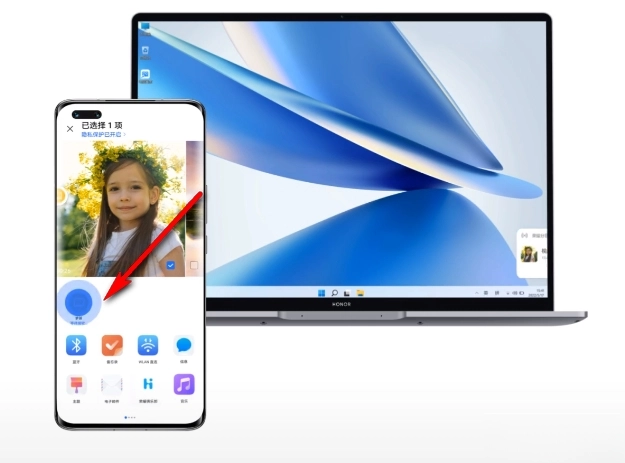 一步分享的操作很简单:在相册、文件管理器这类应用里找到并点击“分享”按钮,接着从分享选项中选择接收方的荣耀设备头像,等对方确认接收后就能启动传输了,整个过程总共只需要两步。