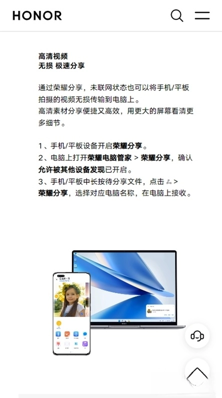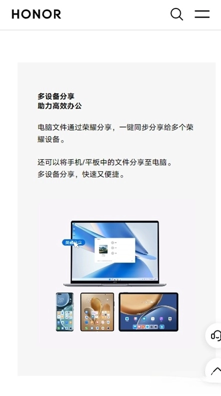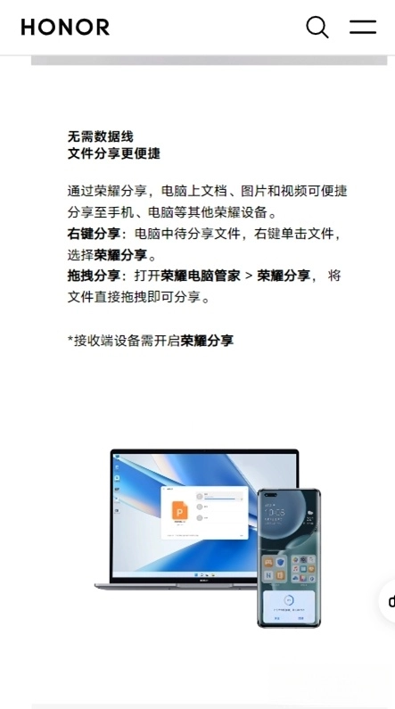 荣耀分享作为荣耀生态系统里的一项革新性文件传输技术,摆脱了对复杂数据线和网络的依赖,能够让荣耀设备之间,甚至和其他更多品牌设备之间,实现高速、无损且无需消耗流量的文件互相传输,让分享操作变得简便又高效。