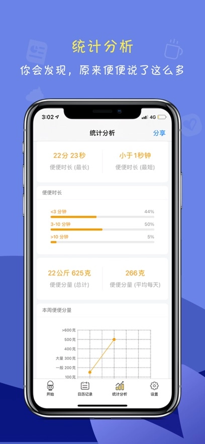 便便健康记录:涵盖排便时长、间隔周期、粪便形状、颜色、重量以及排便时的感受等各类详细信息,并且支持一键将这些记录分享给你的医生。