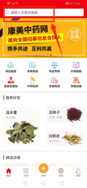 通过顶部搜索框输入药材名称,查找相关信息。