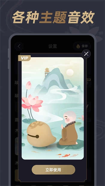 界面设计遵循“少即是多”的理念,没有多余的按钮,核心功能清晰可见;提供一键切换水墨山岚、月照松林、素绢留白等12种东方美学主题背景,视觉体验本身也成为一种修行方式。开启自动敲击模式后,渐进式的节奏会自然引导呼吸放缓、心率降低,实际测试显示使用5分钟就能明显减轻焦虑感。它不传递任何教义,而是以声音为载体,帮助你体会“万籁俱寂时,一击破迷云”的顿悟瞬间——那些烦恼还没来得及被刻意消除,就已悄悄消散了。