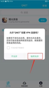 7、回到QNET界面后点击【启动】按钮,当弹出“允许创建VPN连接”的提示时,请选择【始终允许】选项。