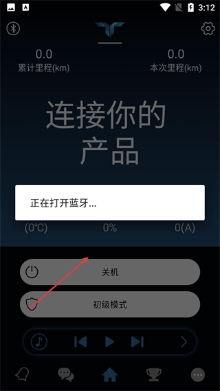 4、完成注册进入主界面后,应用会自动开启蓝牙连接设备,你可以查看累计里程、本次里程等数据,还能对设备模式等功能进行操作。
