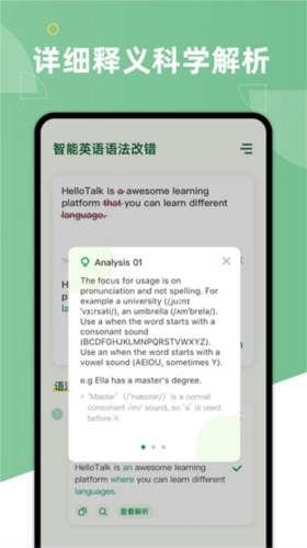 AI Grammar Checker借助详尽的错误原因剖析与语法知识解读,助力用户掌握自身常出现的语法问题,从而防止再次失误。它具备文本与音频同步朗读的功能,搭配地道标准的发音,能让用户在牢记正确英语语法的同时,有效提升语感。该工具可智能修正各类拼写及语法错误,效率高且精准度强。依托HelloTalk平台日均千万次的真实纠错数据积累,AI Grammar Checker如同母语为英语的真人朋友一般,在线为用户纠正英语语法错误。每一处修改都更符合母语使用者的表达习惯,让用户的英语表达更加地道自然!