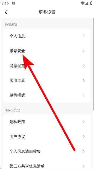 3、在更多设置页面,点击账号安全,进入账号安全页面。