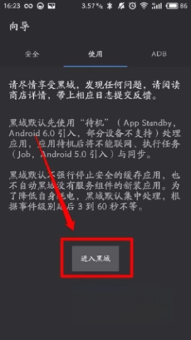 2、打开手机里的“黑域”软件,认真阅读向导内容,一直到切换至“使用”项目卡为止;