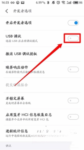 5、在“开发者选项”中,打开“USB调试”功能;