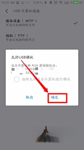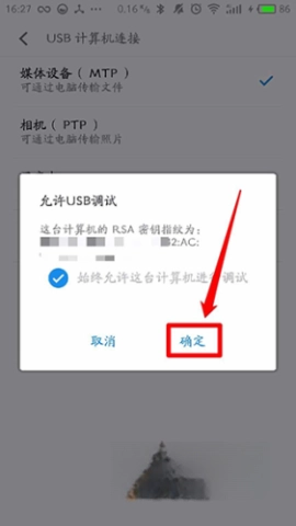 8、点击“确定”按钮以允许USB调试;