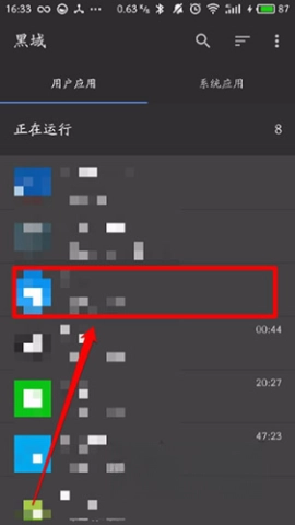 14、进入黑域后选择想要停止后台运行的应用;