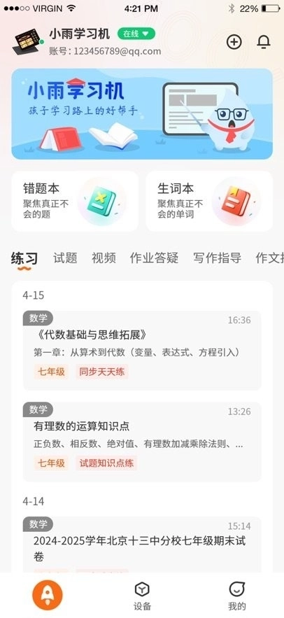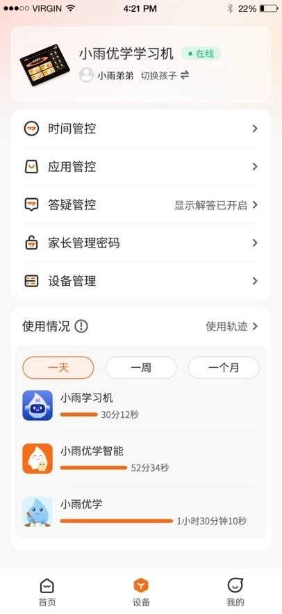 小雨优学智能App作为小雨优学智能硬件的管理平台,能让用户便捷地对小雨优学智能硬件设备进行管理。借助该App,用户可以完成智能硬件设备的绑定与管理操作,还能查看孩子各类学习的历史记录。并且,多个设备能够接入同一个App,便于用户统一管理相关数据。