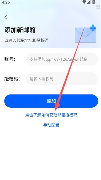 3、进入添加新邮箱的界面后,点击下方的“了解如何获取邮箱授权码”选项。