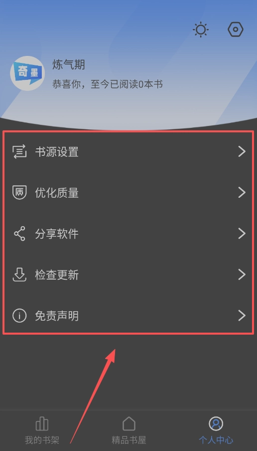 打开应用后,先查看你的炼气期阅读等级,这个等级会记录你的阅读足迹,别忘了去书源设置那里做优化,这可是获得良好阅读体验的前提。