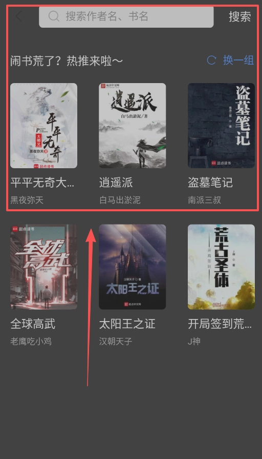 4、好好利用顶部的搜索框,它可以直接找到任何你知道的作品。热推板块的换一组功能,还能给你带来类似《盗墓笔记》《开局签到荒》这类意想不到的随机惊喜。