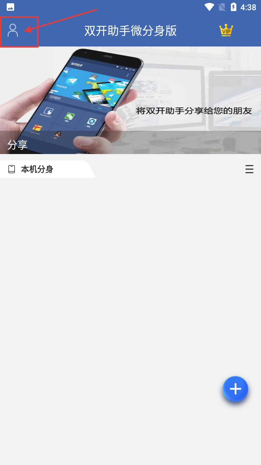 1、打开双开助手微分身版后,在首页点击左上角的个人中心图标,即可进入个人中心页面。