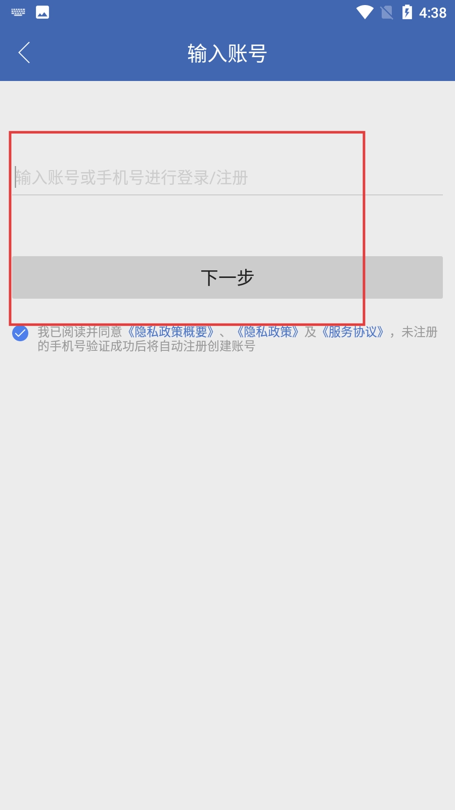 3、在账号输入界面填写账号或手机号码后,点击【下一步】按钮。