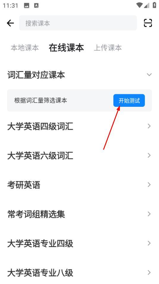 4、于在线课本页面,在依据词汇量筛选课本的附近点击开始测试。